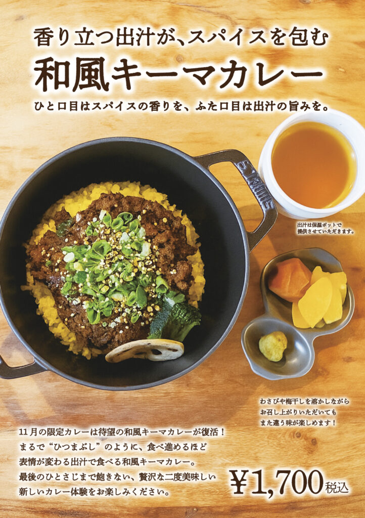 11月の限定カレーは待望の和風キーマカレーが復活!まるで“ひつまぶし”のように、食べ進めるほど表情が変わる出汁で食べる和風キーマカレー。最後のひとさじまで飽きない、贅沢な二度美味しい新しいカレー体験をお楽しみください。